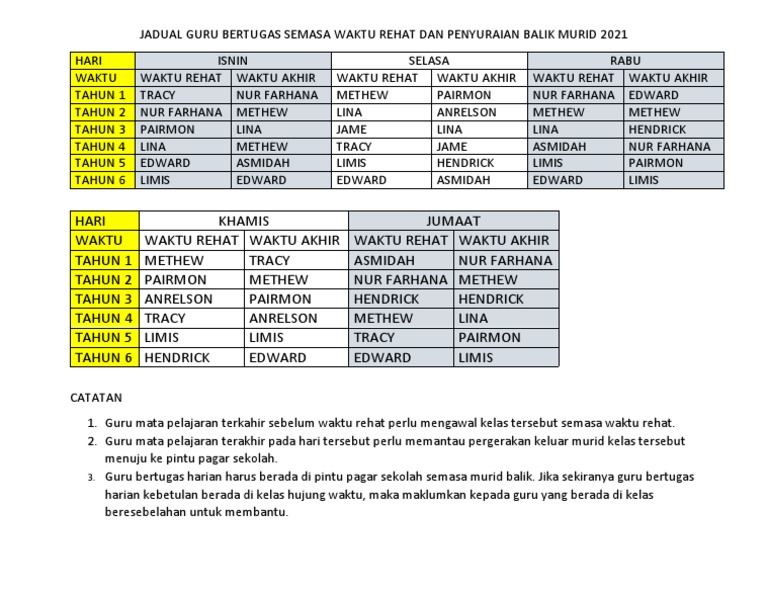 Jadual Guru Bertugas Semasa Waktu Rehat Dan Penyuraian Balik Murid 2021 Pdf